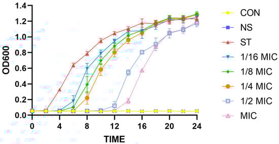 Effect of different treatment dosages of Bacillus licheniformis on growth of Salmonella typhimurium. CON is blank control group; NS is positive control group, which is neomycin sulfate at a concentration of 50 μg/mL; ST is negative control group; and the 1/16 MIC, 1/8 MIC, 1/4 MIC, 1/2 MIC, and MIC groups are the treatment groups with different concentrations of B. licheniformis.
