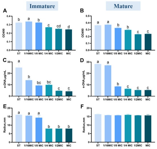 Effect of B. licheniformis on components of biofilm of Salmonella typhimurium. (A,B) The content of exopolysaccharides in mature/immature biofilms of Salmonella typhimurium; (C,D) The content of extracellular DNA (e-DNA) in mature/immature biofilms of Salmonella typhimurium; (E,F) The content of extracellular proteases in mature/immature biofilms of Salmonella typhimurium. Different lowercase letters between groups indicate significant differences (p < 0.05).
