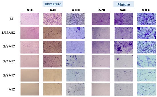 After crystal violet staining, the structure of the biofilm was observed under a light microscope at different multiples. Figure 4 illustrates that both immature and mature Salmonella typhimurium biofilm were affected at different B. licheniformis concentrations and showed a concentration-dependent trend in its anti-biofilm activity.