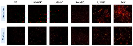 Immunofluorescence observation further confirmed that B. licheniformis can inhibit biofilms. In ST-formed biofilms, most bacteria are dead (stained red). Figure 5 (Immature) shows that with the increase in B. licheniformis concentration, the number of dead bacteria in the biofilm gradually increases, indicating that B. licheniformis promotes Salmonella typhimurium death during co-culture. Meanwhile, mature biofilm groups show results consistent with immature ones (Figure 5 (Mature)).