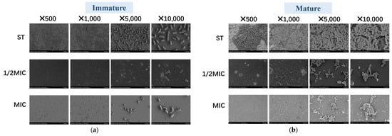 To observe the effect of B. licheniformis on Salmonella typhimurium, bacterial morphology is scanned using SEM. Figure 6 shows that compared with immature biofilms, the ST biofilms in the mature biofilm group thicken, the number of bacteria increases, and the structure becomes more compact as time increases. And bacteria in the ST group are dense, with mature biofilms being even denser. In both immature and mature biofilm assays, bacterial numbers in the 1/2 MIC and MIC groups are significantly lower than those in the ST group. Notably, the bacterial count in the 1/2 MIC immature biofilm is significantly lower than that in the Salmonella typhimurium immature biofilm. These results align with the aforementioned experimental findings, further demonstrating the potent antibiofilm activity of B. licheniformis, as it can both prevent biofilm formation and disrupt mature biofilms.