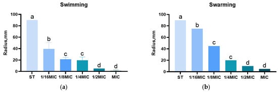 Effect of B. licheniformis on Salmonella typhimurium migration. (a) Effect of different dosage lipopeptide treatment on the level of swimming; (b) Effect of different dosage lipopeptide treatment on the level of swarming. Different lowercase letters between groups indicate significant differences (p < 0.05).