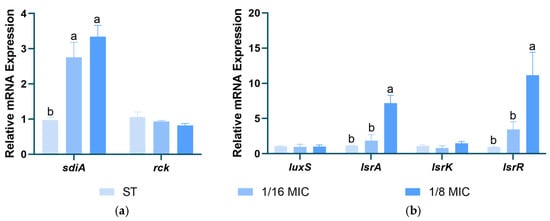 Figure 9 shows the effects of B. licheniformis on the gene expression of Salmonella typhimurium AI-1 and AI-2. The results indicate that B. licheniformis significantly upregulates the expression of the sdiA gene in the type I QS system and the lsrA and lsrR genes in the type II QS system, thereby inhibiting the type II QS system (p < 0.05).
