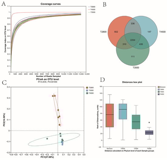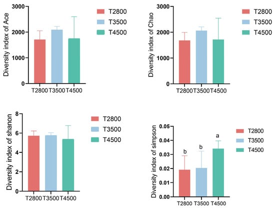 The α-diversity ACE index and Chao index were significantly higher in the T3500 group than in the T2800 group, indicating greater microbial richness in T3500. However, the α-diversity Simpson index and Shannon index showed no significant differences among the three groups (Figure 3).