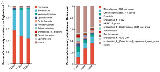 The results showed that Firmicutes had the lowest relative abundance and Bacteroidota had the highest relative abundance in the T2800 group. Additionally, the proportions of Firmicutes and Bacteroidota were significantly higher in T2800 than in T3500 and T4500. A total of four phylum-level differential microorganisms were found among the microbiota of the three altitude groups. The relative abundance of unclassified_d__Bacteria, Bacteria, and WPS-2 increased with altitude, and the relative abundance in T4500 was significantly higher than in T2800. Conversely, the relative abundance of Elusimicrobiota in T2800 was higher than in T3500 and T4500 (Table 3).
