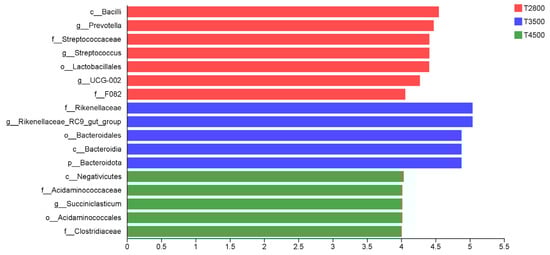 LEfSe analysis showed that Prevotella, Streptococcus, Lactobacillales, and UCG-002 were significantly enriched in the T2800 group. Rikenellaceae_RC9_gut_group and Bacteriodiota were significantly enriched in T3500, while Succiniclasticum was significantly enriched in T4500. Thus, Prevotella, Streptococcus, Lactobacillales, and UCG-002 can be potential biomarkers in T2800, and Succiniclasticum in T4500 (Figure 5).