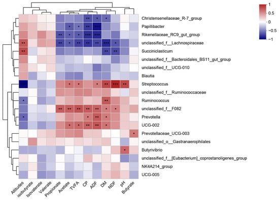 We performed correlation analyses of the top 20 microorganisms in abundance to screen for microorganisms associated with rumen fermentation parameters, elevation, and forage nutrients (Figure 6). The results indicated that unclassified__f__Lachnospiraceae and Succiniclasticum were positively correlated with elevation. Unclassified__f__F082 was positively correlated with propionic acid content, while Rikenellaceae_RC9_gut_group and unclassified__f__Lachnospiraceae were negatively correlated with propionic acid content. Papillibacter and unclassified__f__Lachnospiraceae were negatively correlated with acetic acid content, while Streptococcus and unclassified__f__F082 were negatively correlated with acetic acid content. Notably, Prevotella was positively correlated with forage dry matter content and CP, while Rikenellaceae_RC9_gut_group was negatively correlated with them; this was based on the association with microorganisms and forage nutrients. Papillibacter, Rikenellaceae_RC9_gut_group, and unclassified__f__Lachnospiraceae were negatively correlated with TVFAs content. In contrast, Streptococcus and unclassified__f__F082 were moderately positively correlated with TVFAs.