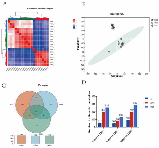 (A) Rumen metabolomics PCA of the three groups of samples; (B) Venn diagram; (C) Sample correlation; and (D) Comparison group histogram.