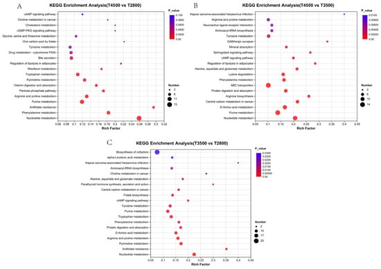 Differential metabolite enrichment pathways analysis for comparisons. (A) T4500 vs. T2800; (B) T4500 vs. T3500; (C) T3500 vs. T2800.