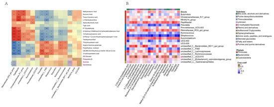(A) The differential metabolite-microbe correlations; (B) Microbial correlates of metabolites with increasing altitude. Note: (A): The horizontal axis represents microorganisms, and the vertical axis represents metabolites. (B): The horizontal axis represents metabolites, and the vertical axis represents microorganisms. Note: * indicates p < 0.05, ** indicates p < 0.01, *** indicates p < 0.001.