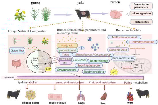 We found that Rikenellaceae_RC9_gut_group and methylmalonic acid, succinic acid, and L-palmitoylcarnitine were significant factors by analyzing differential metabolites with microbial correlation. Rikenellaceae_RC9_gut_group primarily degrades cellulose and hemicellulose in the rumen [47,48]. Methylmalonic acid is related to the synthesis of malonyl coenzyme A, an important precursor of succinic acid in the TCA cycle [49]. We hypothesized that as altitude increases and temperature decreases, the cellulose content of local pasture gradually increases, requiring yaks to have a higher abundance of Rikenellaceae_RC9_gut_group in the rumen to degrade the cellulose and produce short-chain fatty acids. In the degradation of cellulose, energy-related precursors enter the bloodstream through the rumen epithelium and are absorbed by various tissues of the yak to provide energy (Figure 10). This adaptation may help yaks adjust to the plateau environment, but further experiments are needed to verify these reasons.