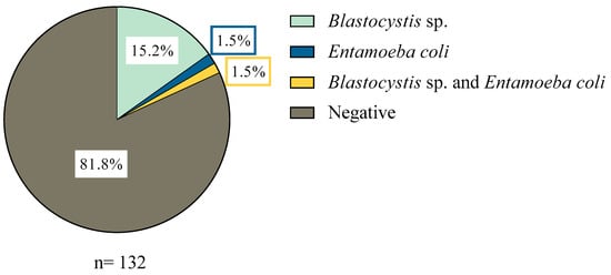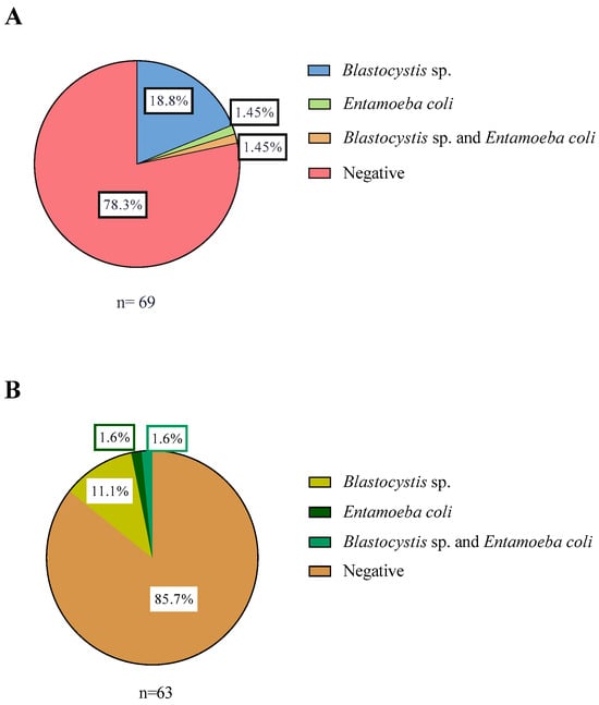 Intestinal protozoa are agents of widespread global distribution, whose transmission occurs mainly through the fecal-oral route through the consumption of water or food contaminated with their resistant stages, such as cysts or oocysts [,]. One of the most prevalent intestinal eukaryotic parasites in the world are Blastocystis sp., with prevalence rates close to 50% in developing countries and up to 20% in developed countries []; and Giardia duodenalis, with infection rates of up to 30% in developing countries and up to 8% in developed countries [,].