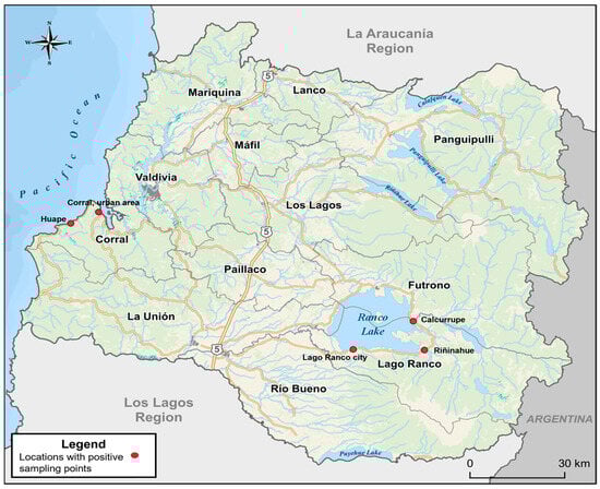 The geographical distribution of the positive sampling points was Corral (urban area), Huape, Lago Ranco (urban area), Riñinahue, and Calcurrupe (Figure 3).