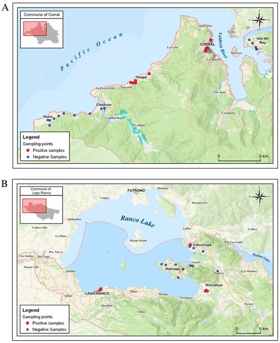 Geographical distribution of positive and negative samples: (A) Sampling points of Corral, commune; (B) Sampling points of Lago Ranco commune.