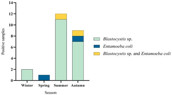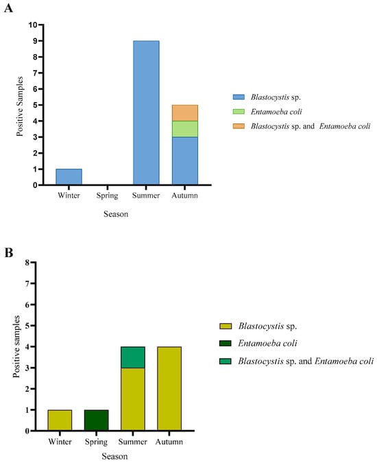 The seasonal distribution in Corral showed that parasites were found in every season of the year, except spring. The highest number of positive samples were found in summer. The highest diversity of parasites was described in autumn, with Blastocystis sp. and Entamoeba coli found in this season. In winter and summer only, Blastocystis sp. was found in our samples (Figure 7A). In Lago Ranco, parasites were detected in every season of the year. Blastocystis sp. was present all through the year, except in spring, where only E. coli was detected. The highest number of positive samples was described in summer and autumn (Figure 7B).