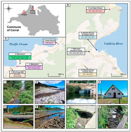 Description of spatial distribution of each subtype of Blastocystis sp. in Corral. (A) Subtypes described in the Huape sector and (B) subtypes described in Corral (Urban Area). Photos 1 to 8 show the exact sampling point in the commune of Corral (RW: Rural Drinking Water; RMS: Rural Medical Station).