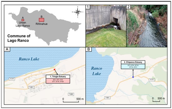Description of spatial distribution of each subtype of Blastocystis sp. in Lago Ranco. (A) Subtypes described in Tringlo estuary sector and (B) subtypes described in Chipanco estuary. Photos 1 and 2 show the exact sampling points in the commune of Lago Ranco.