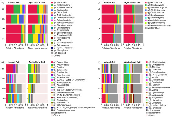 Comparison of relative abundances at the phylum level and of the 20 most abundant bacterial and fungal ASVs across different tomato genotypes grown in natural and agricultural soils. (a) Bacterial phyla; (b) fungal phyla; (c) 20 most abundant bacterial ASVs; (d) 20 most abundant fungal ASVs (Sc = Solanum chilense, Ch = S. lycopersicum var. cerasiforme, PN = S. lycopersicum var. ‘Poncho Negro’, CA = S. lycopersicum var. ‘Cal Ace’). The percentage of abundance for each taxon represents the mean of three biological replicates.
