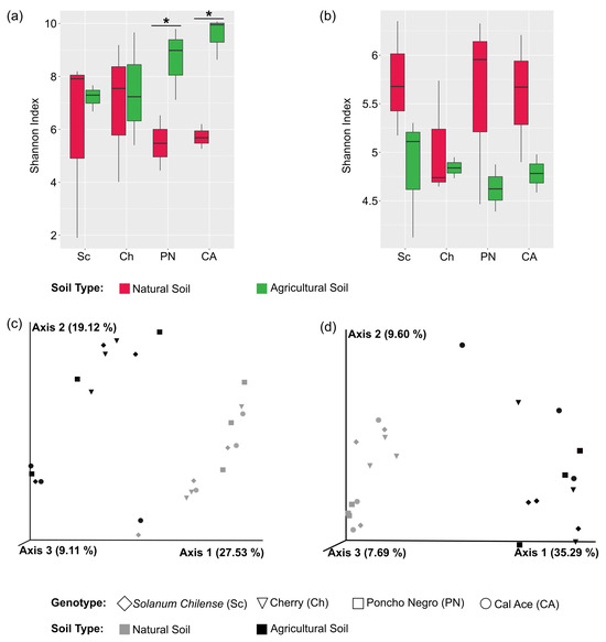 Alpha and beta diversity analyses based on the four evaluated genotypes and both soil types (agricultural and natural). Panels (a,b) show Shannon diversity indices for bacteria and fungi, respectively. Asterisks (*) indicate statistically significant differences detected by ANOVA at p-value < 0.05. Significant differences were only observed when comparing each genotype across the two soil types. Panels (c,d) present the Principal Coordinate Analysis (PCoA) based on unweighted UniFrac distances for bacterial and fungal communities, respectively.