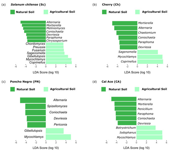 On the other hand, LefSe analysis in fungi consistently revealed a high abundance of the genera Alternaria, Coniochaeta, and Devriesia across all genotypes in natural soil. Additionally, specific fungal taxa were associated with distinct genotypes: Chrysosporium with S. chilense, Chaetomium with Cherry, Spizellomyces with ‘Poncho Negro’, and Penicillium with ‘Cal Ace’. In agricultural soil, only the fungal taxon Mycochlamys was consistently present across all samples. Meanwhile, the genera Sagenomella and Coprinellus were exclusively found in S. chilense and Cherry, respectively, Gibellulopsis was unique to ‘Poncho Negro’, and Botryotrichum and Iodophanus were identified solely in ‘Cal Ace’ (Figure 5).