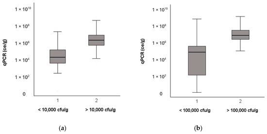 A comparison of cultivation and qPCR results in the Finnish (a) and German (b) datasets. The samples were divided into two groups based on the guideline value of the cultivation method. Group 1: no microbial growth; Group 2: microbial growth. For the division of groups, the national guidelines were used, which are 10,000 cfu/g for Finland and 100,000 cfu/g for Germany.