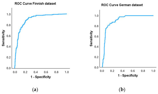 Receiver operating characteristic (ROC) curves were plotted to investigate the performance of the qPCR method for the binary classification of samples in comparison to the cultivation method, which was used as the reference method (Figure 3a,b). For the ROC curve, the true positive rate is plotted against the false positive rate at each threshold setting. The area under the curve is 0.897 for the Finnish dataset and 0.916 for the German dataset.