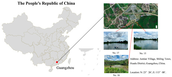 The typical aquaculture ponds were located in Runyuan Aquatic Breeding Farm, Guangzhou City, Guangdong Province (Figure 1; 23°26′ N, 113°08′ E). Three ponds were named No. 15, No. 16, and No. 17, with areas of 11,333 m2, 3333 m2, and 4667 m2, respectively, and a water depth of 1.0 m during the culture period. The three experimental units (No. 15, 16, and 17) were selected according to several specific criteria. These included the depth of the ponds, their water quality, and their previous average production performance. The chosen ponds were of similar depth, water supply, and management methods to ensure consistency in the study. Water quality parameters, such as pH and dissolved oxygen, were also considered to be within acceptable ranges for red tilapia culture. Additionally, the previous average production performances of these ponds were evaluated to ensure they were representative of typical farming levels in the region. Underground water, pre-aerated and fertilized, was added into each pond before red tilapia stocking. The water was fertilized with urea (CH4N2O) at 0.5 mg/L upon initial pond filling to promote phytoplankton growth as supplementary natural feed. This aligns with local tilapia farming practices to enhance primary productivity. The red tilapia juveniles (~3 g) were transferred from nursery ponds into the three aquaculture ponds. These red tilapia juveniles were stocked at a density of 60 tails/m3, as recommended by prior farming practices in the region. During the culture period, the fish were fed a commercial feed with 4% of body weight at 9:00 and 17:00 daily. Feeding was adjusted biweekly based on biomass. The commercial feed of Luobeihou (≥30% crude protein, ≥5% crude lipid, ≤13% crude ash, ≤10% moisture) was purchased from Hailong Sci. & Tech. Co., Ltd. (Zhuhai, China). The culture period was from 6 July 2023 to 13 November 2023, totaling 130 days. Following the completion of the experiment, fish were caught and sold, resulting in a final body weight of approximately 500 g. The rainfall amounts during the culture period were 466.8 mm in July, 365.2 mm in August, 594.5 mm in September, 13.7 mm in October, 38.1 mm in November, and 9.1 mm in December.