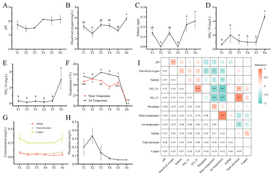 Water quality indicators at different culture stages and their correlations. Six accurate sample times in 2023 were Jul 06 (T1), Jul 29 (T2), Aug 14 (T3), Sep 05 (T4), Sep 25 (T5), and Nov 13 (T6), respectively. n = 3. Changes in (A) pH, (B) dissolved oxygen concentration, (C) salinity, (D) NH4+-N concentration, (E) NO2−-N concentration, (F) water and air temperatures, (G) sulfide, total chromium and copper concentrations, and (H) phosphate concentration across different time points or stages (T1–T6). Different letters indicate statistically significant differences (p < 0.05). Specifically, uppercase letters represent differences among water temperature treatments, and lowercase letters represent differences among air temperature treatments. (I) Correlation heat map showing Pearson’s r values between different water quality indicators; * p < 0.05, ** p < 0.01, *** p < 0.001.