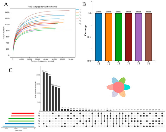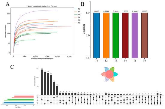 The rarefied curves (A), Good’s coverage (B), and upset diagram (C) of water microalgae at different culture stages. Six accurate sample times in 2023 were Jul 06 (T1), Jul 29 (T2), Aug 14 (T3), Sep 05 (T4), Sep 25 (T5), and Nov 13 (T6), respectively. n = 3. (A) The plateau of rarefied curves indicates that the sequencing depth is sufficient to capture the majority of microalgal diversity in each sample. (B) All samples have near complete coverage (>0.99), confirming that the sequencing depth adequately represents the microalgal communities in each sample. (C) This upset diagram presented 147, 117, 52, 131, 128, and 74 unique OTUs at different culture stages, with 44 shared OTUs. The 44 shared OTUs refer to microalgal taxa that were consistently present across the whole culture period in the pond ecosystems.