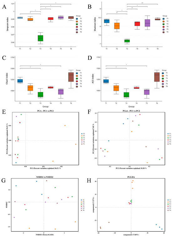 The α diversity and β diversity of water bacteria at different culture stages. Six accurate sample times in 2023 were Jul 06 (T1), Jul 29 (T2), Aug 14 (T3), Sep 05 (T4), Sep 25 (T5), and Nov 13 (T6), respectively. n = 3. (A) Simpson index. (B) Shannon index. (C) Chao 1 index. (D) ACE index. (E) PCA. (F) PCoA. (G) NMDS. (H) PLS-DA. Specifically, * indicates p < 0.05, ** indicates p < 0.01, and *** indicates p < 0.001.