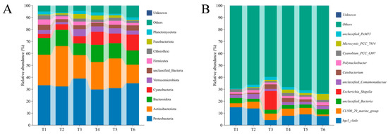 Shift in relative abundance of water bacterial composition at the phyla (A) and genera (B) taxonomic levels. Six accurate sample times in 2023 were Jul 06 (T1), Jul 29 (T2), Aug 14 (T3), Sep 05 (T4), Sep 25 (T5), and Nov 13 (T6), respectively. n = 3.