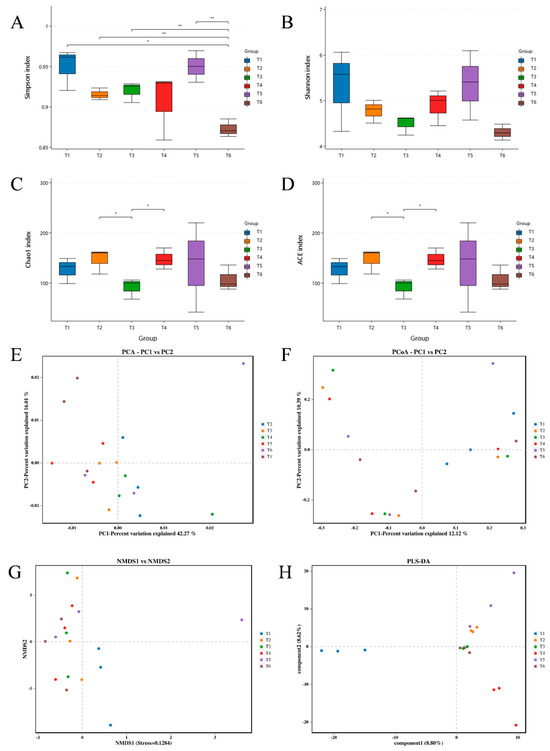 α diversity and β diversity of water microalgae at different culture stages. Six accurate sample times in 2023 were Jul 06 (T1), Jul 29 (T2), Aug 14 (T3), Sep 05 (T4), Sep 25 (T5), and Nov 13 (T6), respectively. n = 3. (A) Simpson index. (B) Shannon index. (C) Chao 1 index. (D) ACE index. (E) PCA. (F) PCoA. (G) NMDS. (H) PLS-DA. Specifically, * indicates p < 0.05, and ** indicates p < 0.01.