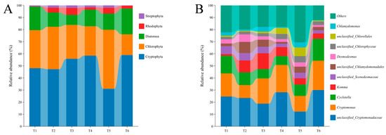Shifts in the relative abundance of water microalgal composition at phyla (A) and genera (B) taxonomic levels. Six accurate sample times in 2023 were Jul 06 (T1), Jul 29 (T2), Aug 14 (T3), Sep 05 (T4), Sep 25 (T5), and Nov 13 (T6), respectively. n = 3.