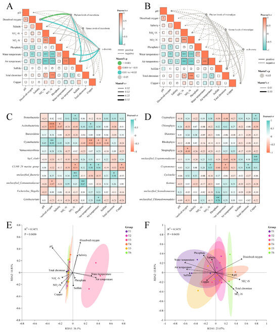 Correlation analysis between water quality indicators and microalgal–bacterial communities. Six accurate sample times in 2023 were Jul 06 (T1), Jul 29 (T2), Aug 14 (T3), Sep 05 (T4), Sep 25 (T5), and Nov 13 (T6), respectively. n = 3. Mantel test between environmental variables and water microbiota, including bacteria (A) and microalgae (B). Pearson correlation analysis between environmental variables and the top five phyla and genera in bacterial (C) and microalgal (D) communities. RDA revealed the major environmental variables in bacterial (E) and microalgal (F) dynamics. Specifically, * indicates p < 0.05, ** indicates p < 0.01, and *** indicates p < 0.001.