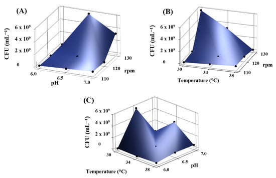 Surface response graphs for viability (CFU mL−1) by Kocuria sediminis As04 comparing (A) pH and rpm, (B) temperature and rpm, and (C) temperature and pH.