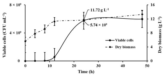 The relationship between dry biomass production and viable cells (CFU mL−1) is presented in a graph that compares both parameters using the kinetics of the treatment with the highest biomass production (T30:130:6.5) (Figure 3).