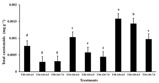 The total carotenoid content showed statistically significant variation among the Taguchi treatments (p < 0.05). Treatment T38:130:6.0 exhibited the highest carotenoid concentration (0.0016 mg g−1), followed by treatment T30:130:6.5 (0.0014 mg g−1), with a significant difference between them (Figure 4). Both treatments also presented significantly higher carotenoid levels than the remaining treatments, indicating their effectiveness in promoting carotenoid accumulation under the tested conditions. The second treatment had the highest biomass production.