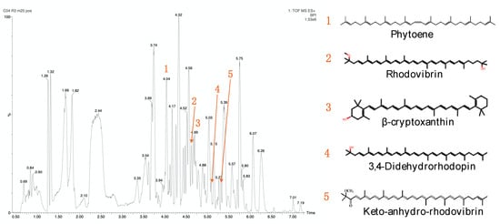 Key carotenoid compounds were identified from the extract obtained from Kocuria sediminis As04, such as Phytoene, β-cryptoxanthin, Rhodovibrin, 3,4-didehydrorhodopin, and Keto-anhydro-rhodovibri (Figure 5, Table 4). Other Kocuria species have been reported to produce β-cryptoxanthin [28,53] and to present phytoene [42].
