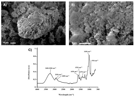 Structural characterization of Kocuria sediminis AS04 by SEM: (A) 1000× and (B) 5000×; (C) cellular spectrum by FTIR.