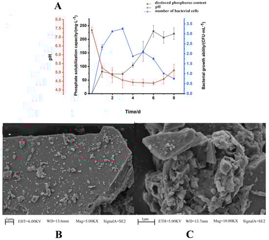 Phosphorus/potassium-solubilizing capability of SQ-2. (A): determination of phosphorus solubility of SQ-2; (B): SEM image of potassium feldspar; (C): determination of potassium solubility of SQ-2.