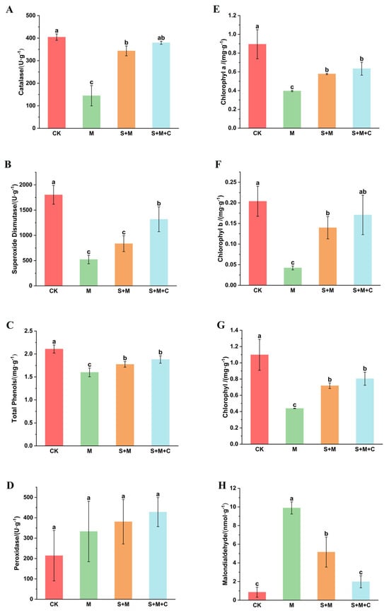 As shown in Figure 2, in the four soil treatments, the catalase, superoxide dismutase, total plant phenol, and chlorophyll contents in the rice of the SQ-2 group (S + M) and SQ-2–biochar group (S + M + C) were significantly elevated compared to those in the Al/Pb group (M) (p < 0.05). Specifically, the catalase levels in the SQ-2 group and SQ-2–biochar group increased by 137.5% and 162.5%, respectively (Figure 2A). Concurrently, superoxide dismutase activity exhibited a 60.14% and 162.9% increase, respectively (Figure 2B). The total phenolic content of rice rose by 10.9% and 17.6%, respectively (Figure 2C). Concurrently, the total chlorophyll content exhibited a marked increase of 63.8% and 83.7%, as depicted in Figure 2G. Despite the observed variations in peroxidase content among the four experimental groups, these changes did not attain statistical significance (Figure 2D).