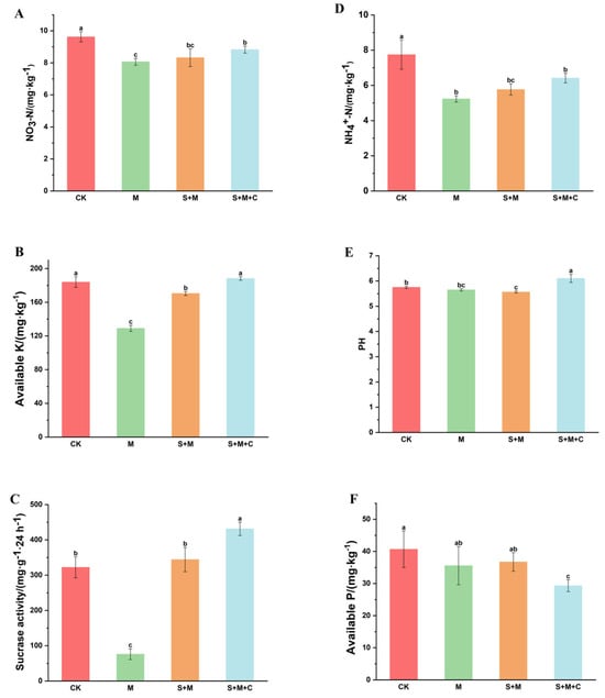 The combined application of biochar and PGPR has been demonstrated to enhance soil nutrients, thereby promoting plant growth and increasing yield [33]. As illustrated in Figure 3, in general, both the SQ-2–biochar combination and the single application of SQ-2 enhanced the physicochemical properties of the rice rhizosphere soil. In the SQ-2–biochar group (S + M + C group), nitrate nitrogen, available potassium, and sucrase in the rhizosphere soil were significantly increased by 9.4%, 45.9%, and 466.8%, respectively, compared to those in the Al/Pb group (M) (Figure 3). It should be noted that the detection of sucrase utilized soil fresh weight, and in enzyme activity-related tests, fresh soil enzymes often exhibited higher activity than those in air-dried samples. The ammonium nitrogen in the soil of the SQ-2–biochar group (S + M + C) was found to be 22.6% higher than that in the Al/Pb group (M), although this increase was not statistically significant (Figure 3D). Furthermore, the SQ-2–biochar group (S + M + C group) demonstrated a significantly higher pH level compared to the other three groups (Figure 3E). However, the available phosphorus in the soil of the SQ-2–biochar group (S + M + C group) decreased by 15% compared to that in the Al/Pb group (M).