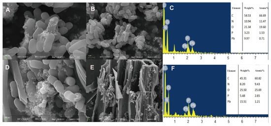 We used SEM-EDS to observe the microstructure of bacterial cells following metal treatment and to determine heavy metal adsorption on the surfaces of bacteria and biochar. After exposing the strain to Pb2+ (Figure 4A,B), the bacteria exhibited short and thick rod-shaped structures with a relatively smooth surface. However, some cells adhered to each other, and a substantial number of granular chelates were attached to the cell surface. We hypothesized that Pb2+ precipitated and adsorbed onto the bacterial surface. Similarly, when the strain was treated with Pb2+ and biochar (Figure 4D,E), a large amount of Pb precipitate adsorbed on the surface of bacteria and biochar could be observed. But the amount of precipitate on the cell surface increased. And a large number of bacteria were observed adhering to the biochar.