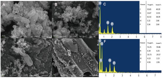 After treating the strain with Al3+ (Figure 5A,B), a significant amount of spherical precipitates adhered to the cell surface, and the bacterial body underwent a certain degree of deformation and depression. When the strain was treated with Al3+ and biochar (Figure 5D,E), a large amount of sediment was adsorbed on the surfaces of the bacteria and biochar. It is hypothesized that Al3+ can better adhere to the extracellular polysaccharides produced by the bacteria, resulting in the even distribution of the metal on the surfaces of the bacteria and biochar. EDS analysis revealed that the SQ-2–biochar group contained a large amount of carbon (C), nitrogen (N), and oxygen (O) elements, and the corresponding metal elements were characterized after adding different metals (Figure 4C,F and Figure 5C,F).