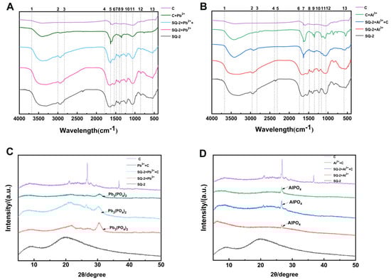 During the process of adsorption, metals have been observed to exert toxicity on bacteria, thereby prompting the activation of their defense mechanisms in order to resist external stimuli. Furthermore, the surface of bacteria is characterized by the presence of polysaccharides, proteins, and lipids, which possess a high adsorption capacity for metal ions. This property facilitates the mineralization and precipitation of metals, thereby reducing their toxicity [34]. In this study, we utilized FTIR to identify the functional groups involved in the adsorption process, thereby determining the extracellular reaction mechanism. Figure 6A,B display the FTIR spectra of Pb2+ and Al3+ adsorption by SQ-2–biochar, respectively.
