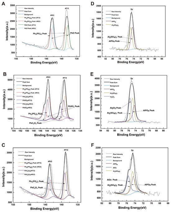 XPS spectrum of precipitation products. (A): SQ-2 + Pb2+; (B): biochar + Pb2+; (C): SQ-2–biochar + Pb2+; (D): SQ-2 + Al3+; (E): biochar + Al3+; (F): SQ-2–biochar + Al3+.