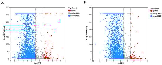 Transcriptome analysis of metal ion adsorption by strain SQ-2. (A): Volcano plot of SQ-2 under Pb2+ stress vs. CK. (B): Volcano plot of SQ-2 under Al3+ stress vs. CK.