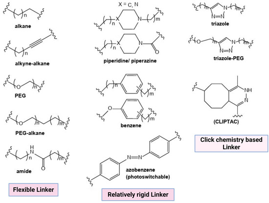 Linkers are the connecting link between the anchor (E3 ligase-binding domain) and a “warhead” (POI-binding domain). PROTAC selectivity, solubility, stability, flexibility, and degradation efficacy depend on the linker length, type, and composition [14]. Thus, in order to design PROTACs with desired characteristics, the linker properties are modified. The most commonly used PROTAC linkers include polyethylene glycol, triazole, alkyl chains, piperazine, and amide bonds (Figure 2).