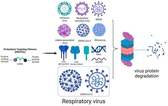 Traditionally, the prevention and control of respiratory viral infections rely on vaccines and antivirals. Effective vaccines or antiviral drugs are available for only a few respiratory viruses. High mutation rates of viruses such as the influenza virus and SARS-CoV-2 hinder the efficacy of available vaccines. However, the effectiveness of antiviral drugs, like neuraminidase (NA) inhibitors (oseltamivir) and M2 ion channel blockers (amantadine), is limited by the emergence of drug-resistant viral strains and adverse side effects [6]. The dynamics of respiratory virus evolution emphasize the critical need for advanced novel technologies to develop effective vaccines and antiviral drugs. Over the past few years, targeted protein degradation (TPD) has emerged as a promising technology in the development of medical countermeasures (MCMs), such as proteolysis-targeting chimeras (PROTACs). Thus, we evaluate the advancement and application of PROTAC technology in the field of virology. This review summarizes the advancements in PROTAC-based antivirals and PROTAC vaccines, the challenges, and future prospects.