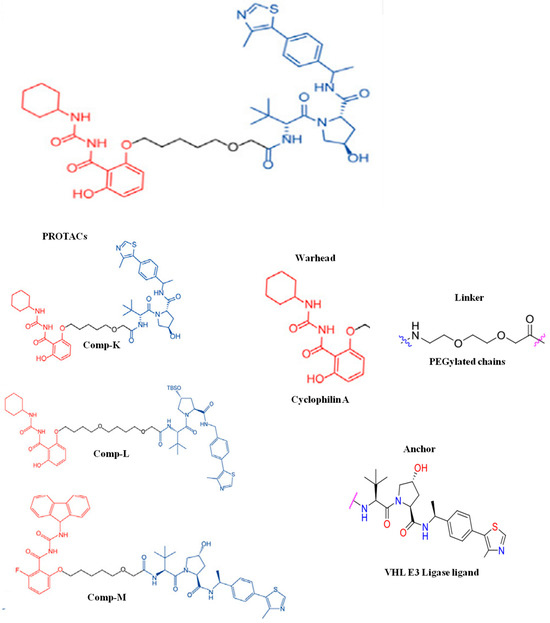The PROTAC has ability to target approximately 80% human proteins, which includes transcription factors (c-Myc, STAT3), RNA-binding proteins, epigenetic targets, kinases (Bruton Tyrosinase Kinase), receptors (AR, ER, RAR, PR, EPGF), scaffold proteins (beta-catenin, KSR1/2, p62/SQSTM1, NEMO/IKKγ, Axin1/2), and mutant proteins, eliminating the limitations of traditional drugs [10]. The strategy used for targeting POIs includes inhibitor-based warheads (indomethacin-based PROTACs and cyclin-dependent kinase-based PROTACs) and antimicrobial-based warheads (oseltamivir-based PROTACs and telaprevir-based PROTACs) [11,12,13].